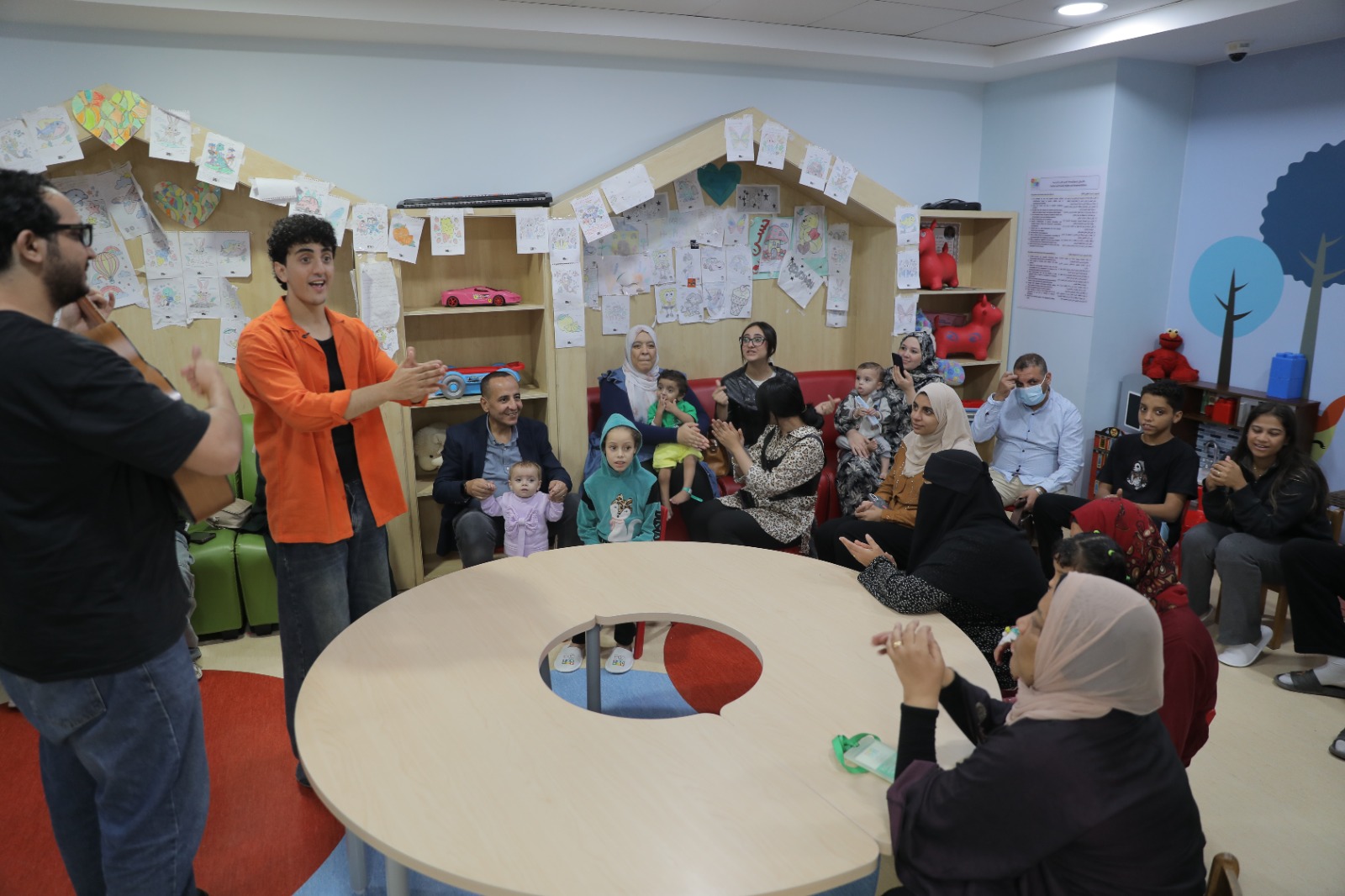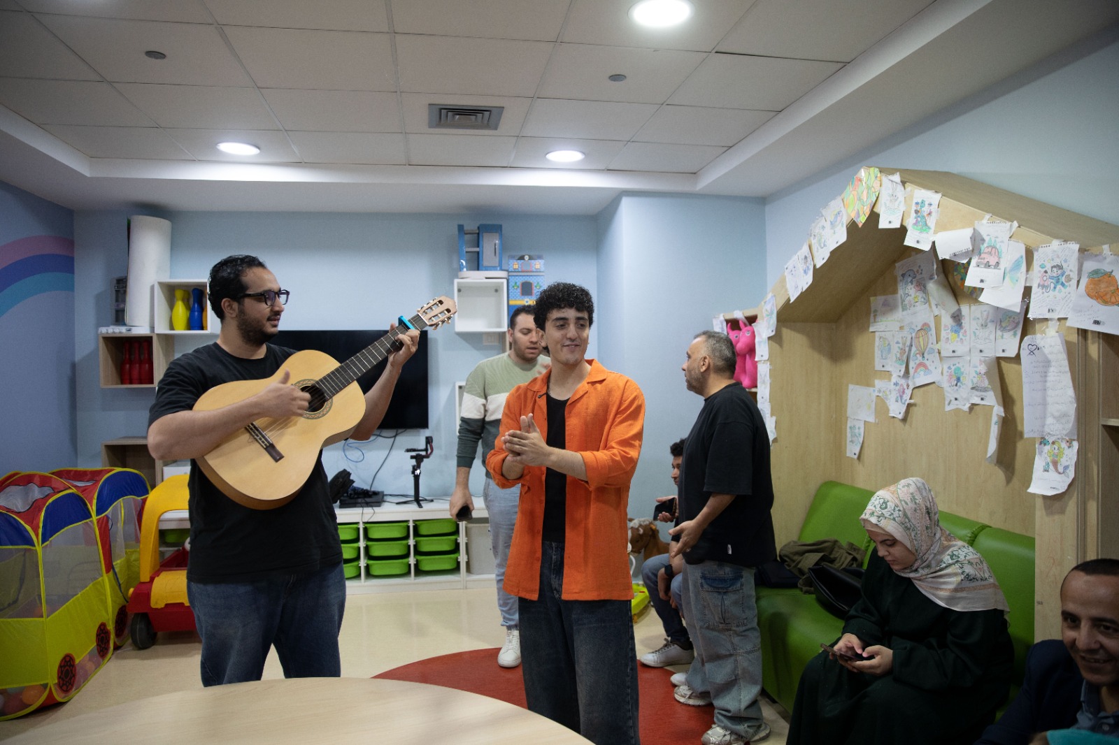 وفي أجواء مبهجة، قدم فريق 3 اخوات، فقرات غنائية للأطفال وأسرهم داخل منطقة الألعاب بالمستشفى، لتسود حالة من السعادة والفرحة على وجوه الجميع، حيث تفاعل الأطفال وأسرهم، وكذلك العاملين بالمستشفى مع الأغاني والعزف على الجيتار الذى قدمه حور ومحمد وماسة، وزملائهم من الموسيقيين.