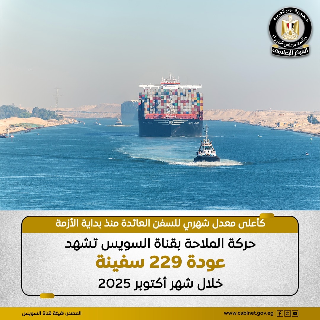 حيث سجلت إحصائيات الملاحة بالقناة خلال شهر أكتوبر الماضي عودة 229 سفينة كأعلى معدل شهري للسفن العائدة منذ بداية الأزمة.