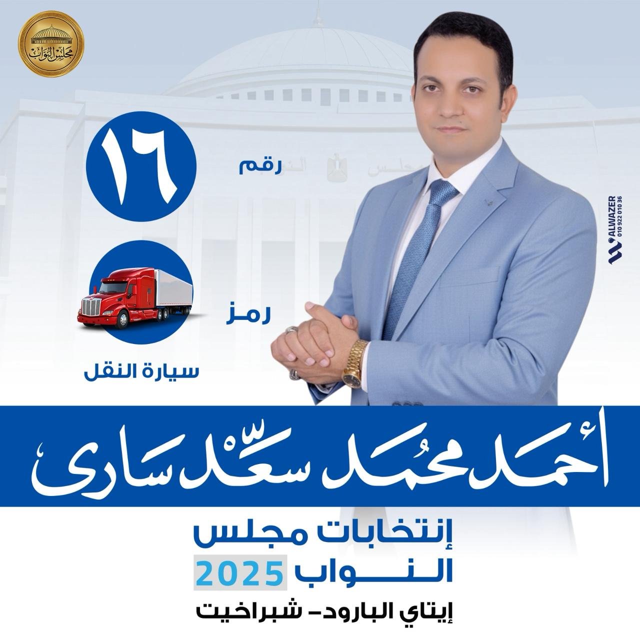 ( احمد محمد سعد ساري ) ابن قرية اشليمه مركز ايتاي البارود محافظة البحيره المرشح عن دائرتي ايتاي البارود وشبراخيت رقم 16 ورمز السياره النقل .