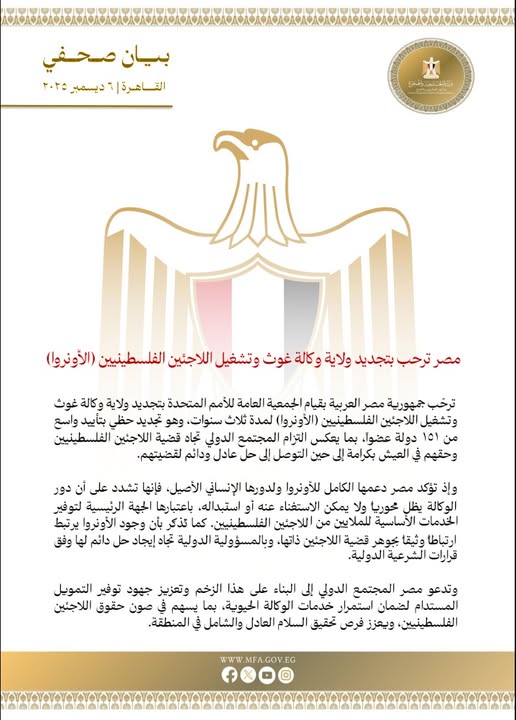 ترحب جمهورية مصر العربية بقيام الجمعية العامة للأمم المتحدة بتجديد ولاية وكالة غوث وتشغيل اللاجئين الفلسطينيين (الأونروا) لمدة ثلاث سنوات، وهو تجديد حظي بتأييد واسع من ١٥١ دولة عضوا بما يعكس التزام المجتمع الدولي تجاه قضية اللاجئين الفلسطينيين وحقهم في العيش بكرامة إلى حين التوصل إلى حل عادل ودائم لقضيتهم.