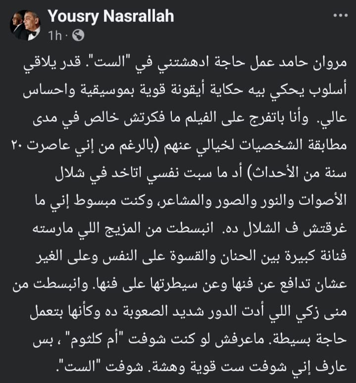 وكتب يسري نصر الله عبر حسابه بمنصة “فيسبوك”: “ مروان حامد عمل حاجة ادهشتني في “الست”،لا قدر يلاقي أسلوب يحكي بيه حكاية أيقونة قوية بموسيقية واحساس عالي، وأنا باتفرج على الفيلم ما فكرتش خالص في مدى مطابقة الشخصيات لخيالي عنهم “بالرغم من إني عاصرت 20 سنة من الأحداث”.