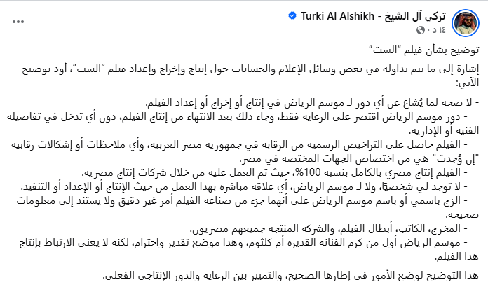 موسم الرياض أول من كرم الفنانة القديرة أم كلثوم، وهذا موضع تقدير واحترام، لكنه لا يعني الارتباط بإنتاج هذا الفيلم.