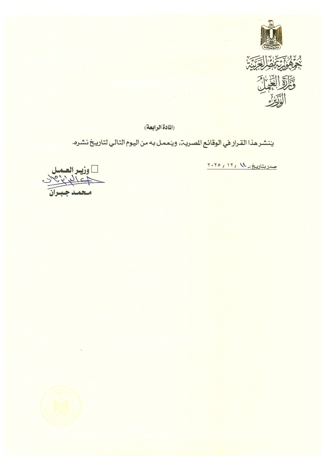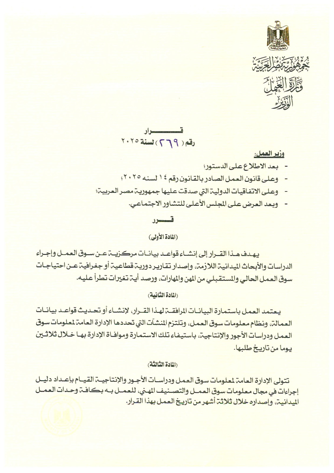 أصدر وزير العمل محمد جبران القرار الوزاري رقم (269) لسنة 2025، بشأن إنشاء وتحديث قواعد بيانات سوق العمل، بعد الاطلاع على الدستور، وقانون العمل رقم 14 لسنة 2025، والاتفاقيات الدولية ذات الصلة، وبعد العرض على المجلس الأعلى للتشاور الاجتماعي.