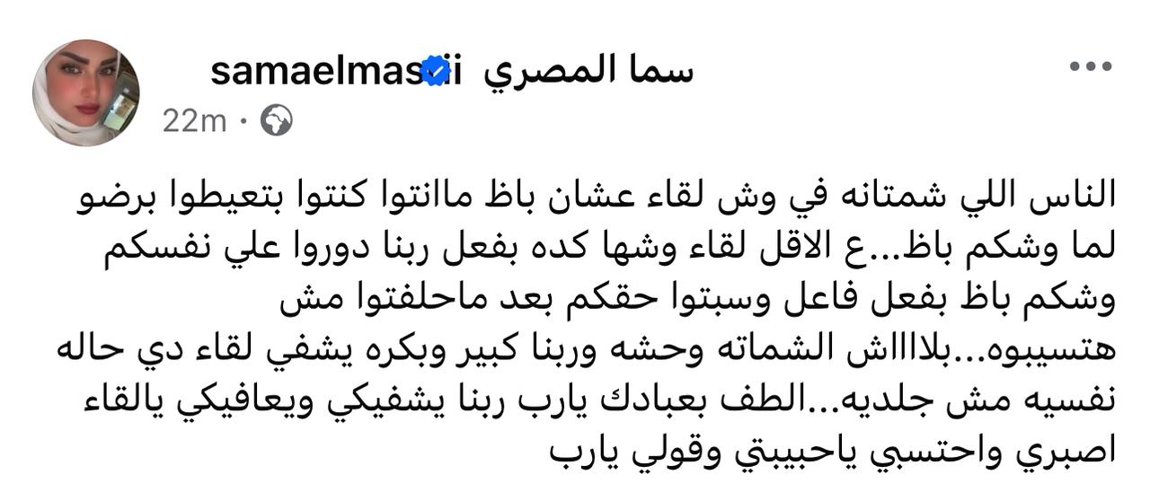 قامت الفنانة سما المصري بنشر منشور على حسابها الشخصي بموقع التواصل الاجتماعي “فيسبوك”: “الناس اللي شمِتت في وجه لقاء عشان باظ، ما أنتم كنتم تبكون أيضًا عندما احترق وجهكم”.