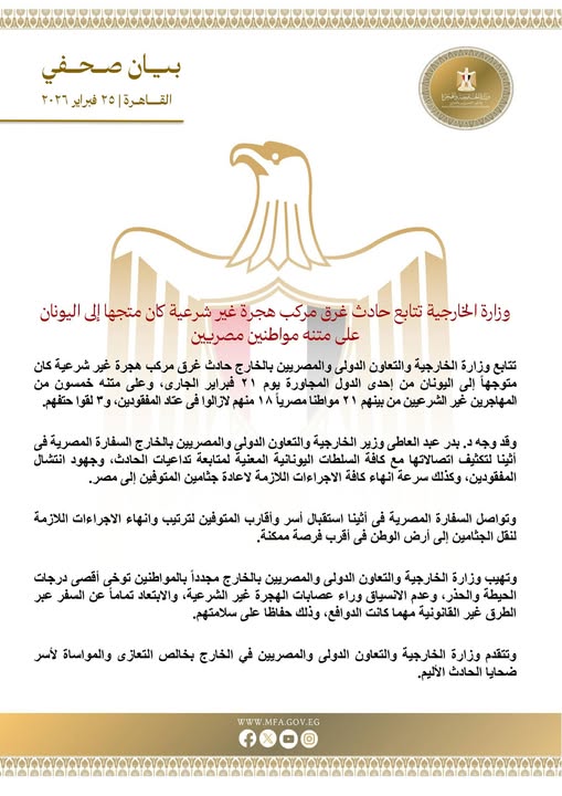 تتابع وزارة الخارجية والتعاون الدولي والمصريين بالخارج حادث غرق مركب هجرة غير شرعية كان متوجها إلى اليونان من إحدى الدول المجاورة يوم ۲۱ فبراير الجارى، وعلى متنه خمسون من المهاجرين غير الشرعيين من بينهم ۲۱ مواطنا مصرياً ۱۸ منهم لازالوا فى عتاد المفقودين، و 3 لقوا حتفهم.