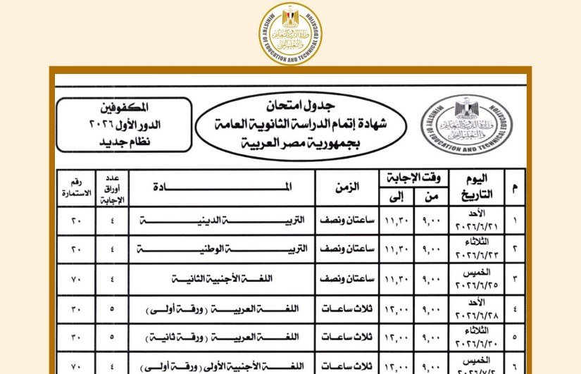 جدول امتحانات الثانوية العامة 2026 (نظام جديد)